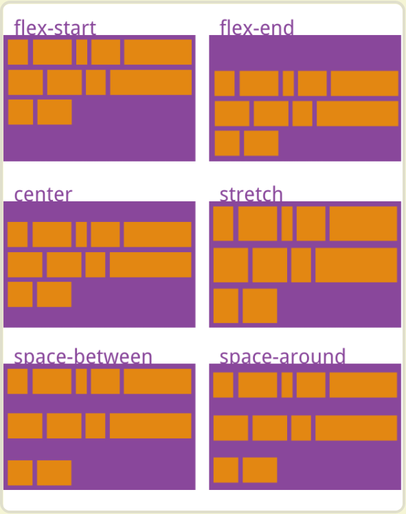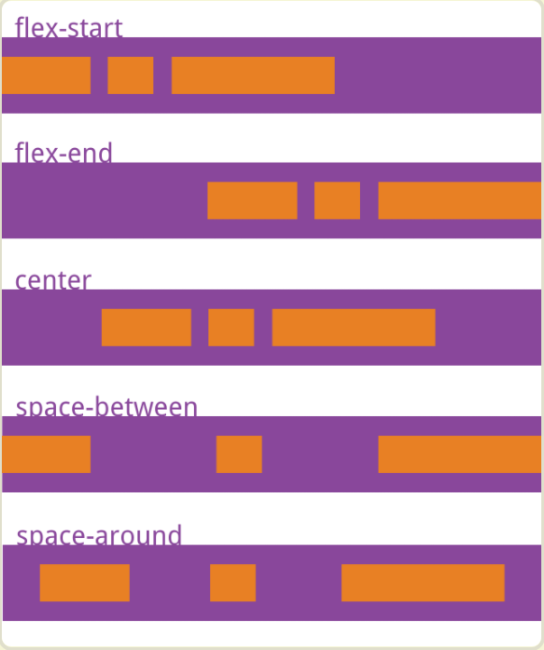 justify-content: flex-start | flex-end | center | space-between | space-around;