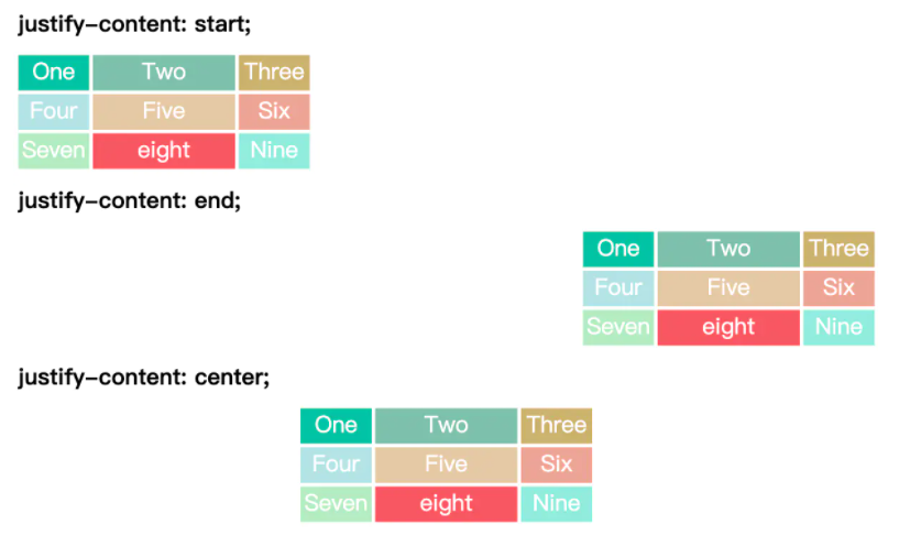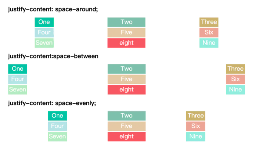 space-around - 每个项目两侧的间隔相等。所以,项目之间的间隔比项目与容器边框的间隔大一倍