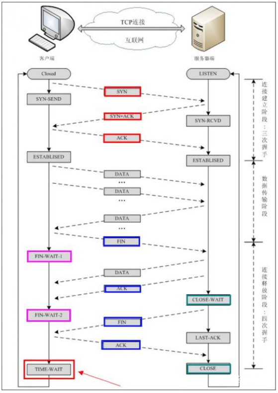 LAST_ACK的状态 - 第四次挥手:客户端收到 FIN 之后,一样发送一个 ACK 报文作为应答,且把服务端的序列号值 +1 作为自己 ACK 报文的序列号值,此时客户端处于 TIME_WAIT 状态。需要过一阵子以确保服务端收到自己的 ACK 报文之后才会进入 CLOSED 状态,服务端收到 ACK 报文之后,就处于关闭连接了,处于 CLOSED 状态