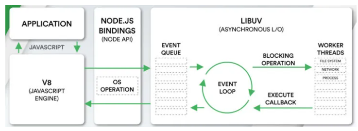 而在NodeJS中,事件循环是基于libuv实现,libuv是一个多平台的专注于异步 IO 的库,如下图最右侧所示: