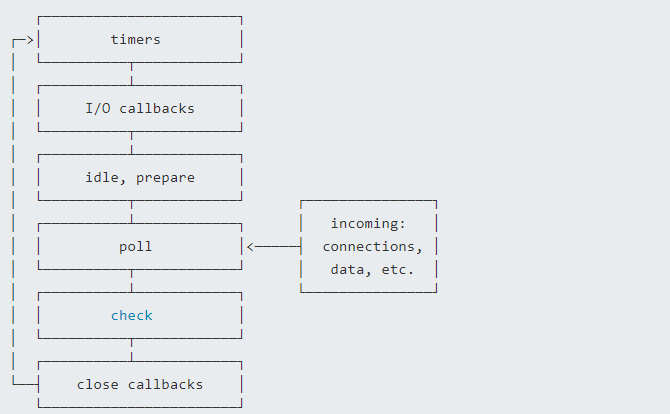 - 关闭事件回调阶段(close callback):一些关闭的回调函数,如:socket.on('close', ...)