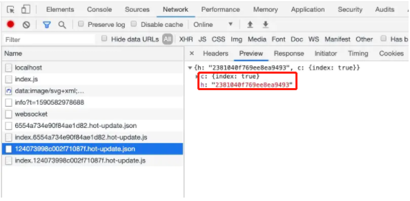 由于socket服务器在HMR Runtime 和 HMR Server之间建立 websocket链接,当文件发生改动的时候,服务端会向浏览器推送一条消息,消息包含文件改动后生成的hash值,如下图的h属性,作为下一次热更新的标识