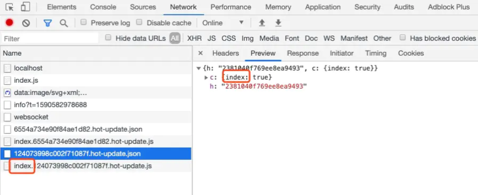 - 当 socket server 监听到对应的模块发生变化时,会生成两个文件.json(manifest 文件)和.js 文件(update chunk)