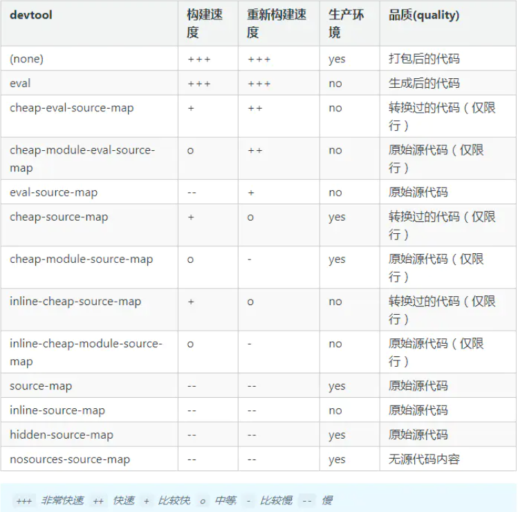 打包生成 sourceMap 的时候,如果信息越详细,打包速度就会越慢。对应属性取值如下所示: