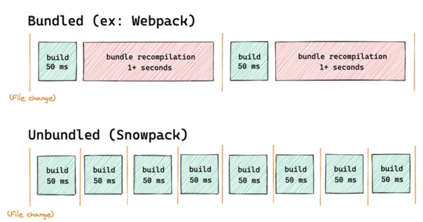 开发阶段,每次保存单个文件时,Webpack和Parcel都需要重新构建和重新打包应用程序的整个bundle。而Snowpack为你的应用程序每个文件构建一次,就可以永久缓存,文件更改时,Snowpack会重新构建该单个文件