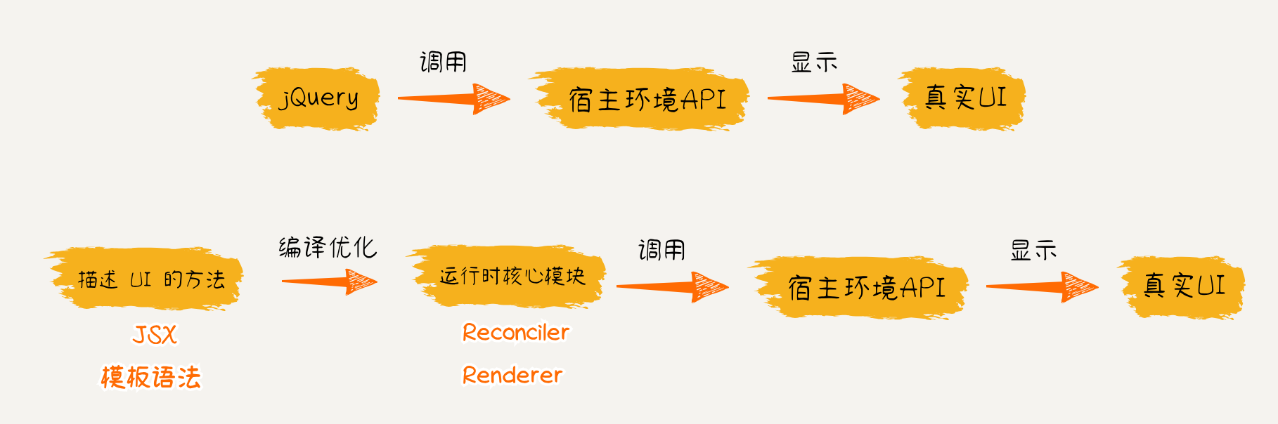 然而,随着前端框架的出现,工作方式发生了根本性的变化,从过程驱动转变为状态驱动。在状态驱动的模式下,开发者不再直接操作宿主环境 API,而是通过前端框架提供的运行时核心模块来管理页面状态和更新。这些核心模块,例如 React 中的 Reconciler 和 Vue 中的 Renderer,负责将开发者编写的代码翻译成对应的宿主环境 API 调用,以更新页面。