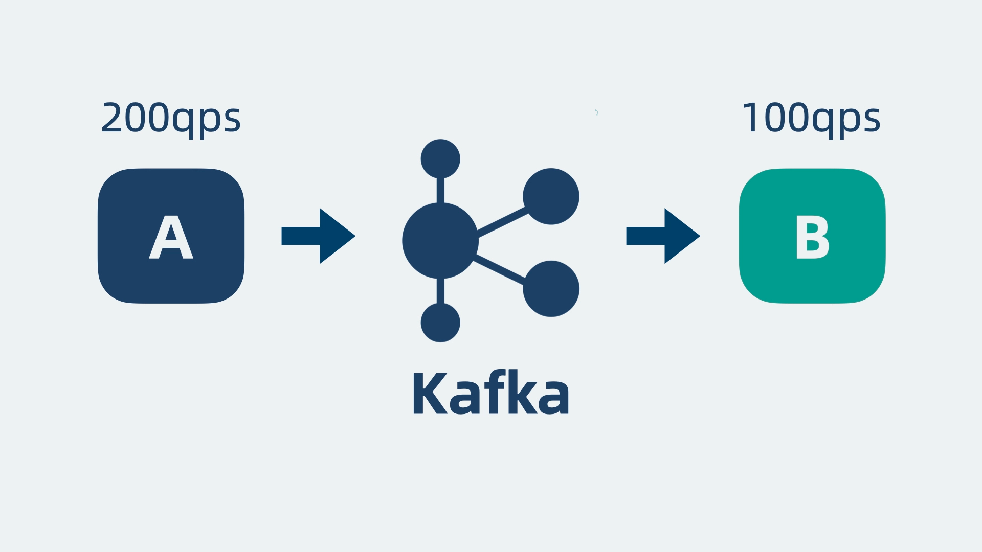 假设我们有两个服务:A 和 B。A 每秒生成 200 条消息,而 B 每秒只能处理 100 条消息。如果直接通信,B 很容易崩溃。为了缓解压力,我们可以在两者之间加入一个缓冲层,这就是消息队列的基本思想。