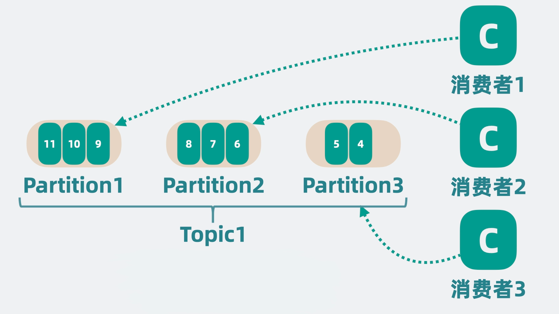 但单个 topic 的消息还是可能过多,我们可以将单个队列,拆成好几段,每段就是一个 partition 分区,每个消费者负责一个 partition。
