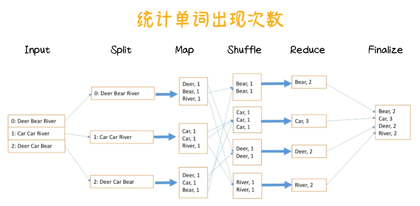 (Bear, 2),(Car, 3),(Dear, 2),(River, 2)。 - Finalize 阶段:将 Reduce Task 的输出结果写入数据库。