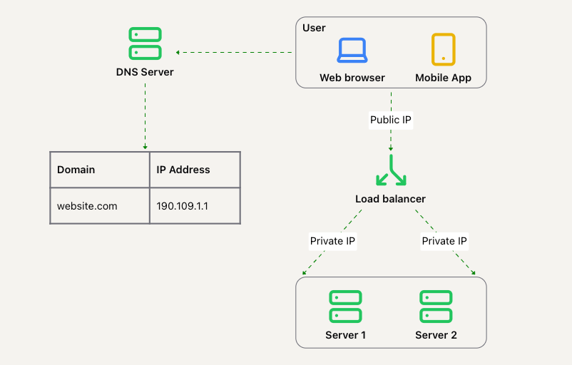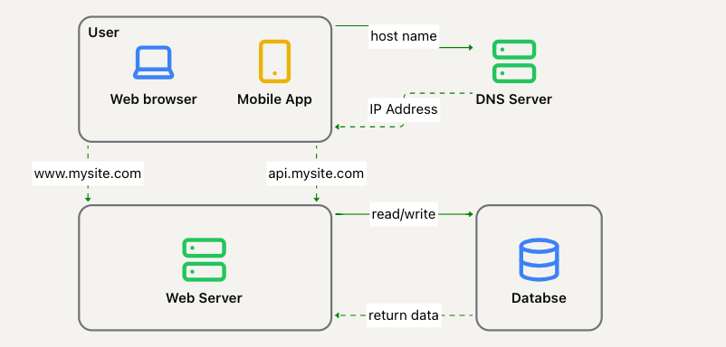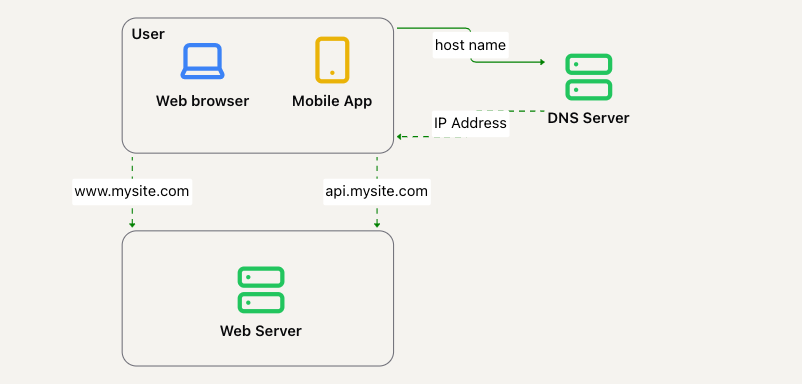 api.mysite.com -> 15.125.23.214)。通常,DNS 服务是由第三方提供,而不是自己托管。 - HTTP 请求从用户设备直接发送到服务器(通过其 IP)。
