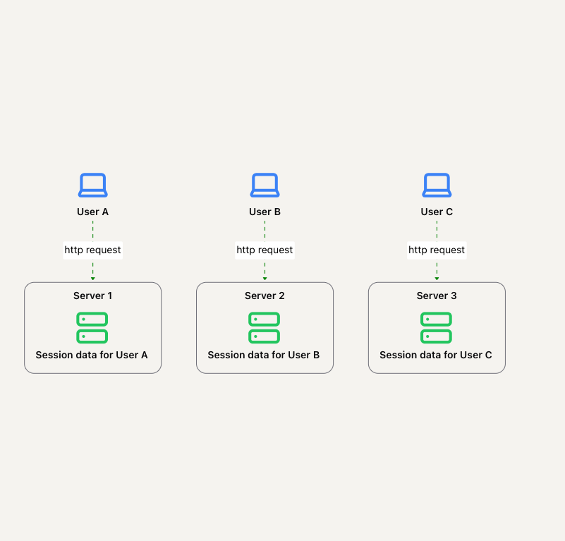 在上述情况下,用户与存储其会话数据的服务器绑定。如果他们向另一个服务器发起请求,另一个服务器将无法访问该用户的会话数据。