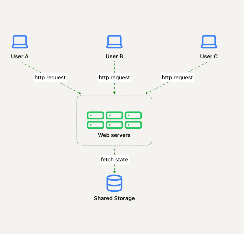 相反,服务器将数据存储在一个所有服务器都可以访问的共享数据存储中。