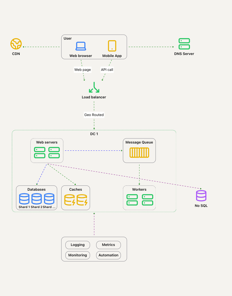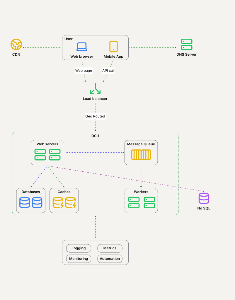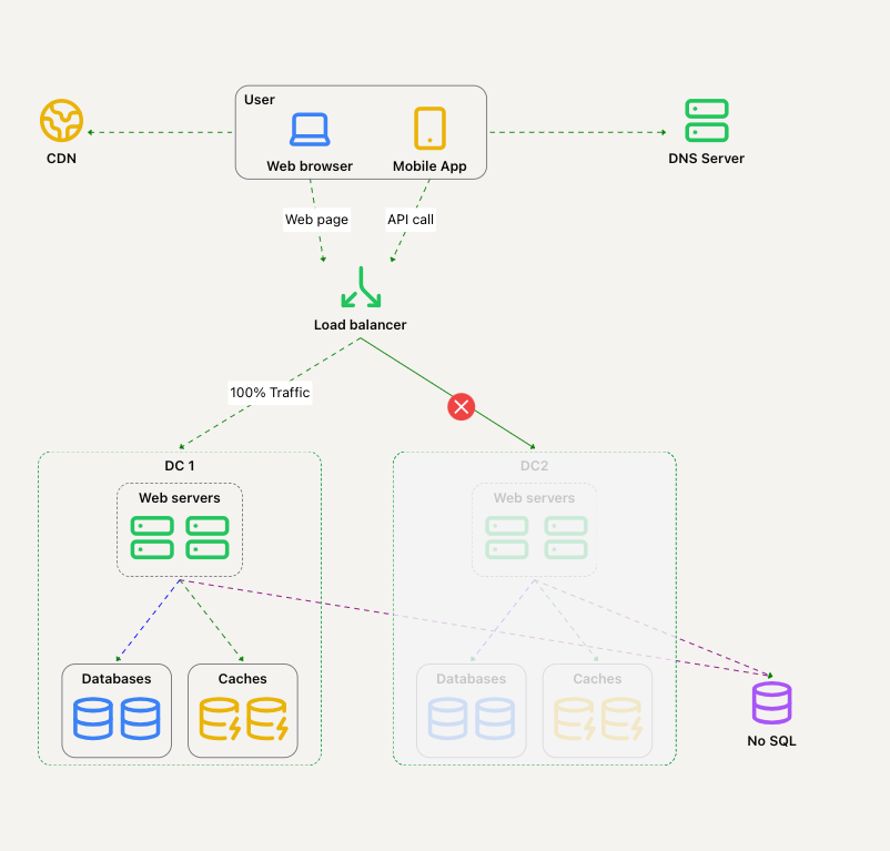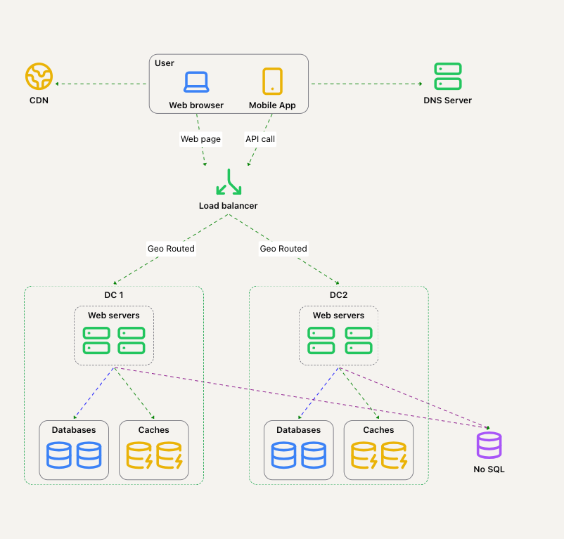 - 流量重定向:需要工具正确地将流量引导到正确的数据中心。可以使用 GeoDNS 来实现这一点。