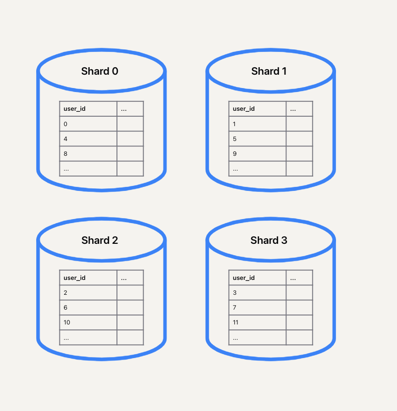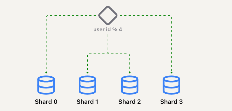 一种分片数据库的方法是基于某个键,将该键均匀地分配到所有分片中,通常使用取模运算符: